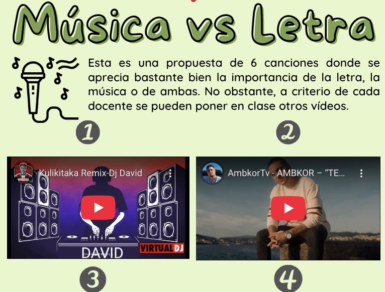 • Propuesta de 6 canciones seleccionadas a propósito donde se aprecia la importancia de la letra o la música. No obstante, cada profe puede hacer su selección particular teniendo las plantillas de la actividad. En el PDF están los enlaces a los vídeos de Youtube de las canciones