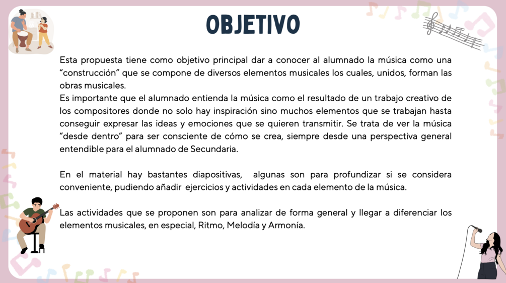 Esta es una propuesta que tiene como objetivo principal dar a conocer al alumnado la música como una “construcción” que se compone de diversos elementos musicales los cuales, unidos, forman las obras musicales.