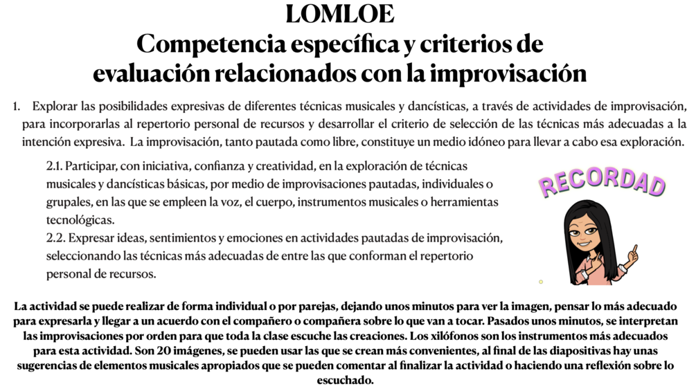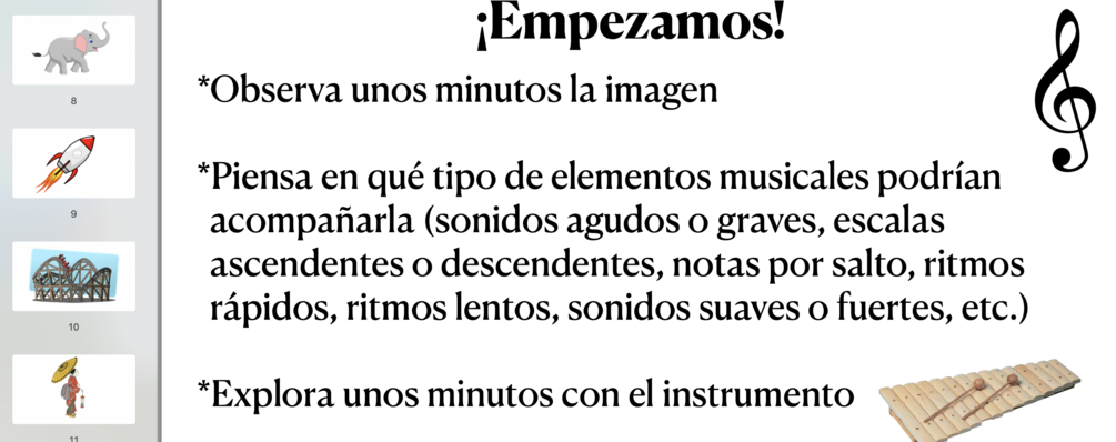 "Improvisación y exploración sonora" a través de imágenes es una actividad muy interesante y divertida que da la oportunidad a todo el alumnado de expresar a través de la música lo que sugieren algunas imágenes. Se trabajan muchos elementos musicales y tiene beneficios importantes que fomentan la autoestima, la participación, la colaboración, etc. En la LOMLOE tenemos un criterio de evaluación que precisamente se centra en la improvisación como medio de aprendizaje musical. Esta actividad es ideal para comenzar la exploración sonora y utilizando el xilófono u otro instrumento de placas la actividad es sencilla ya que otros instrumentos son más complejos. En el xilófono se aprecia fácilmente el sentido ascendente y descendente de las escalas, los intervalos por salto, las notas agudas o las graves, etc. y es fácil realizar improvisaciones lentas o rápidas según se necesite.