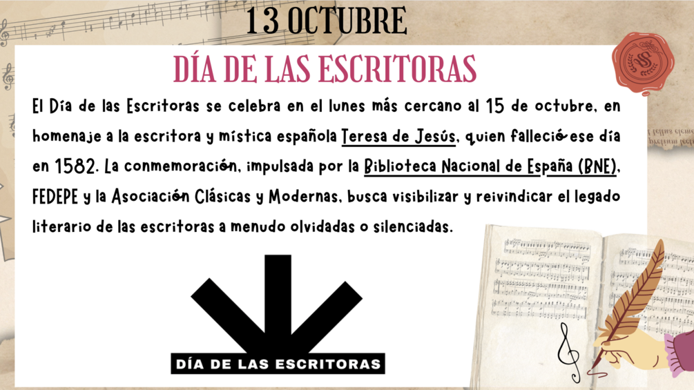 El Día de las Escritoras se celebra el lunes más cercano al 15 de octubre, en homenaje a la escritora y mística española Teresa de Jesús, quien falleció ese día en 1582. La conmemoración, impulsada por la Biblioteca Nacional de España (BNE), FEDEPE y la Asociación Clásicas y Modernas, busca visibilizar y reivindicar el legado literario de las escritoras a menudo olvidadas o silenciadas.