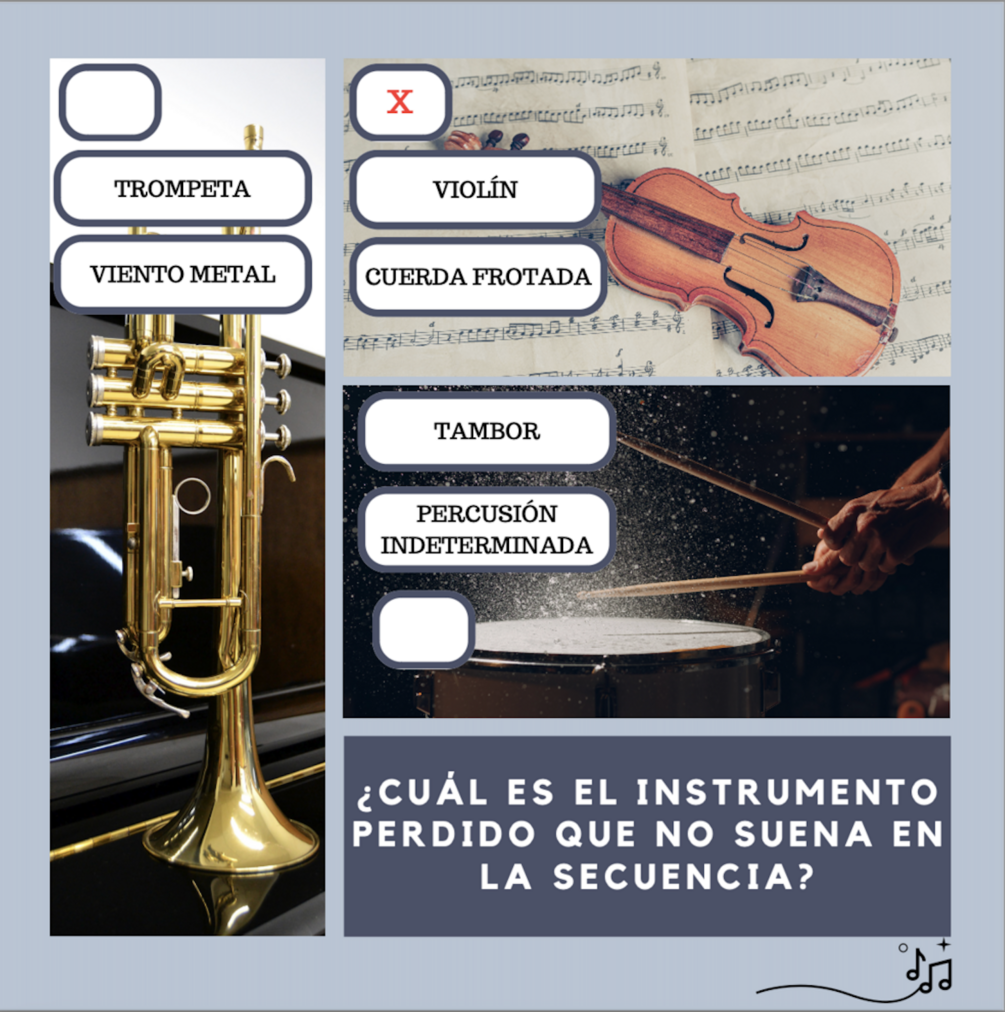 "El instrumento perdido" es una actividad muy completa para repasar el tema de los instrumentos musicales ya que se trabaja el reconocimiento visual de los instrumentos, el reconocimiento auditivo y la clasificación por familias orquestales o por clasificación técnica. Además, la dinámica de la actividad es un juego-reto ya que el alumnado tiene que encontrar el instrumento perdido en cada tarjeta.
