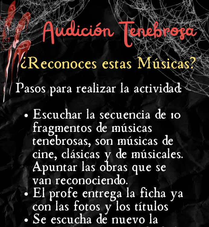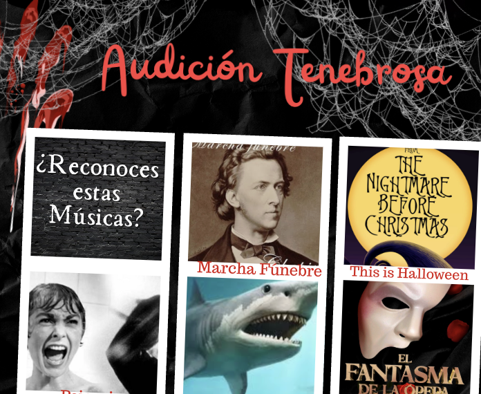 ¿Reconoces estas Músicas? Esta es una actividad de audición para estas fechas de Halloween y del Día de todos los Santos para conocer cómo se ha reflejado el tema de la muerte, el terror, la noche de Halloween, etc. a través de la música. Hemos seleccionado 10 fragmentos conocidos de obras clásicas, musicales y bandas sonoras para reconocerlas auditivamente y también se puede aprovechar para comentar los elementos musicales que hacen que la música suene tenebrosa.